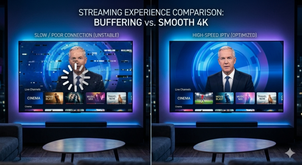سرعة الإنترنت عامل أساسي. إذا كانت السرعة ضعيفة أو غير مستقرة، فلن تحصل على IPTV بدون تقطيع مهما كان السيرفر قويًا. يفضل توفر سرعة لا تقل عن 15 Mbps للمشاهدة بجودة عالية.